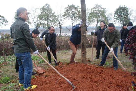 植树现场,大家三五组合,分工协作,有的挥锹铲土,有的扶树浇水,经过同事们共同努力,一棵棵樟树在道路两旁迎风挺立,一株株松树苗也在神仙坡上展露出勃勃生机。