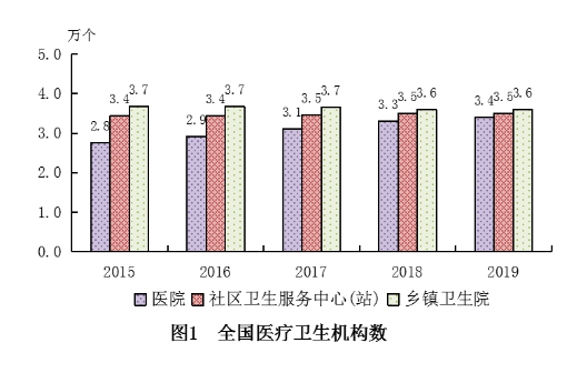 (一)医疗卫生机构总数。2019年末,全国医疗卫生机构总数达1007545个,比上年增加10112个。其中:医院34354个,基层医疗卫生机构954390个,专业公共卫生机构15924个。与上年相比,医院增加1345个,基层医疗卫生机构增加10751个(见表1)。