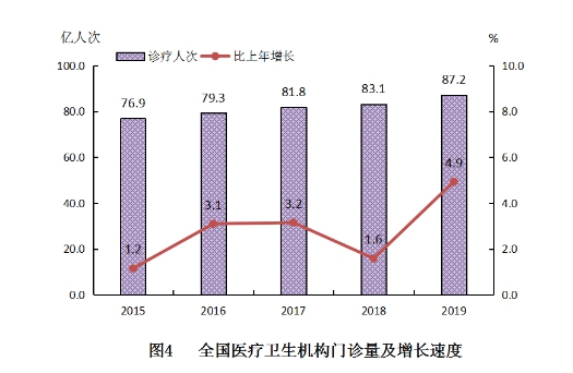 (一)门诊和住院量。2019年,全国医疗卫生机构总诊疗人次达87.2亿人次,比上年增加4.1亿人次(增长4.9%)。2019年居民到医疗卫生机构平均就诊6.2次。