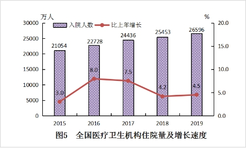 2019年,全国医疗卫生机构入院人数26596万人,比上年增加1143万人(增长4.5%),年住院率为19.0%。